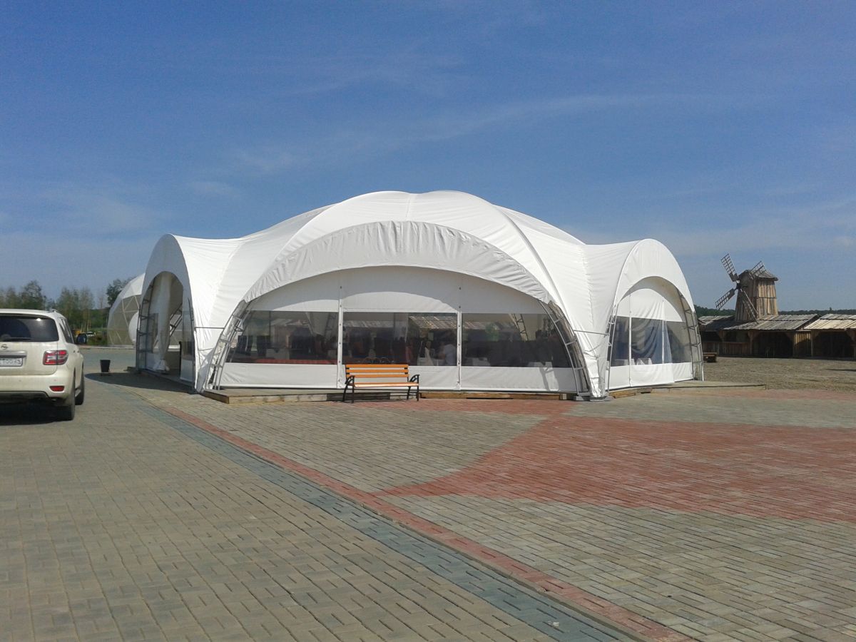 Шатер арочного типа для летнего кафе, свадьбы и т.д. Большой размер, красивая форма, оптимальная цена. Шатер имеет металлический каркас из профильной трубы и тент из материала ПВХ морозостойкого, что позволяет использовать его зимой.