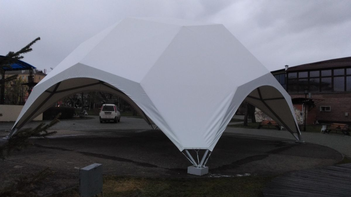 Шатер геокупольной формы по оптимальной цене. Шатер имеет металлический каркас из профильной трубы и тент из материала ПВХ морозостойкого, что позволяет использовать его зимой. Форма шатра позволяет выдерживать высокую снеговую и ветровую нагрузку. Геокупольные шатры могут дополнительно комплектоваться дверьми, вентиляционными дефлекторами, прозрачными окнами. Каркас конструкции собирается из труб 2-4 различных размеров на болтовых соединениях. Тент геокупола цельный, надевается бригадой из 2-3 человек, равномерно натягивая его по поверхности каркаса.