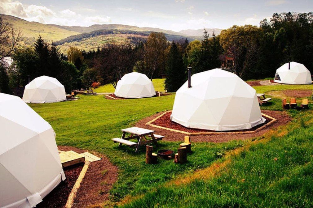 Шатер геокупольной формы по оптимальной цене. Шатер имеет металлический каркас из профильной трубы и тент из материала ПВХ морозостойкого, что позволяет использовать его зимой. Форма шатра позволяет выдерживать высокую снеговую и ветровую нагрузку. Геокупольные шатры могут дополнительно комплектоваться дверьми, вентиляционными дефлекторами, прозрачными окнами. Каркас конструкции собирается из труб 2-4 различных размеров на болтовых соединениях. Тент геокупола цельный, надевается бригадой из 2-3 человек, равномерно натягивая его по поверхности каркаса.