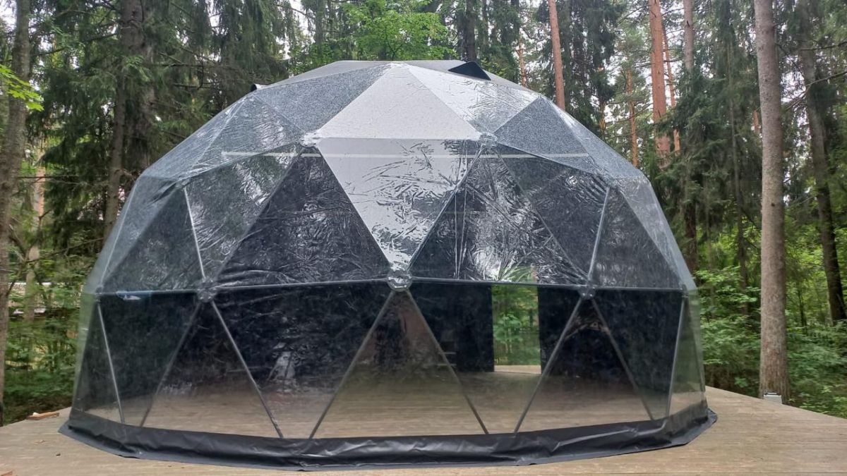 Шатер геокупольной формы по оптимальной цене. Шатер имеет металлический каркас из профильной трубы и тент из материала ПВХ морозостойкого, что позволяет использовать его зимой. Форма шатра позволяет выдерживать высокую снеговую и ветровую нагрузку. Геокупольные шатры могут дополнительно комплектоваться дверьми, вентиляционными дефлекторами, прозрачными окнами. Каркас конструкции собирается из труб 2-4 различных размеров на болтовых соединениях. Тент геокупола цельный, надевается бригадой из 2-3 человек, равномерно натягивая его по поверхности каркаса.