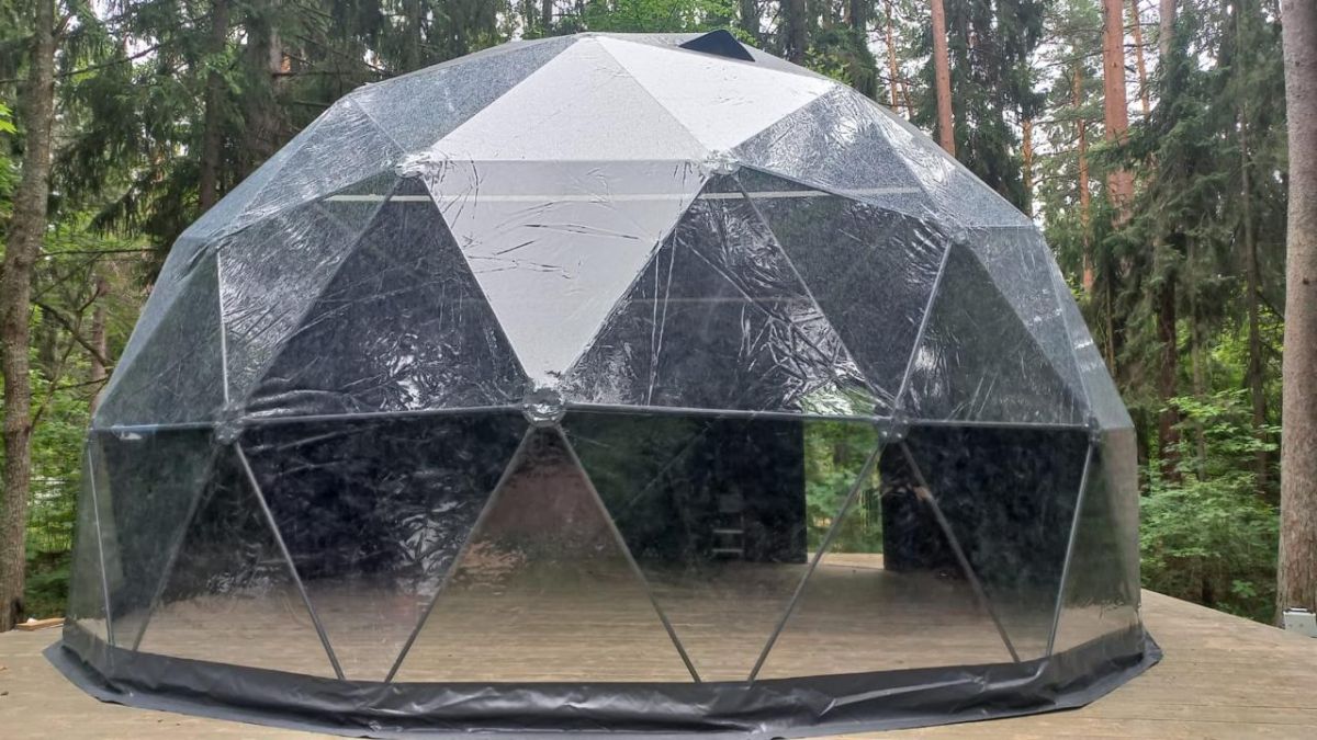 Шатер геокупольной формы по оптимальной цене. Шатер имеет металлический каркас из профильной трубы и тент из материала ПВХ морозостойкого, что позволяет использовать его зимой. Форма шатра позволяет выдерживать высокую снеговую и ветровую нагрузку. Геокупольные шатры могут дополнительно комплектоваться дверьми, вентиляционными дефлекторами, прозрачными окнами. Каркас конструкции собирается из труб 2-4 различных размеров на болтовых соединениях. Тент геокупола цельный, надевается бригадой из 2-3 человек, равномерно натягивая его по поверхности каркаса.