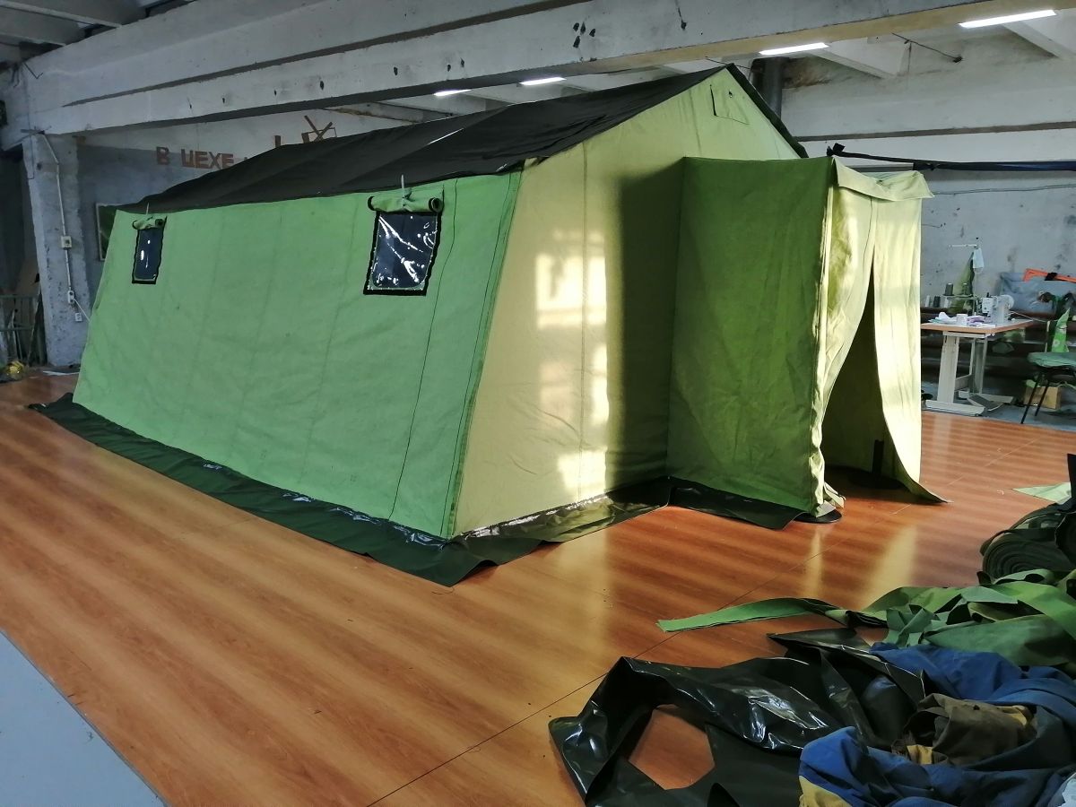 «Палатка каркасная М-10» имеет один вход, двухскатную крышу, вертикально-наклонные стенки внутреннего и наружного наметов. Окна в палатке размещены на торцевых стенках. Вход в палатку расположен на торцевой стенке, который закрывается внахлест и застегивается на клеванты. Палатка имеет один выход дымохода и вентиляционные окна. Каркас палатки изготовлен из стали с антикоррозионным защитным полимерным покрытием и представляет собой стальные трубы, которые фиксируются переходниками. Все конструктивные элементы каркаса являются унифицированными и равновеликими – все несущие трубы имеют равную длину, соединительные элементы – переходники – выполнены в виде крестовин. Внешний намёт палатки выполнен из двусторонней ткани с ПВХ-покрытием, плотностью не менее 630 г/м2. Ткань с ПВХ покрытием надежно защищает от атмосферных осадков, все соединительные швы дают полную гарантию от протекания швов в течение срока эксплуатации палатки.