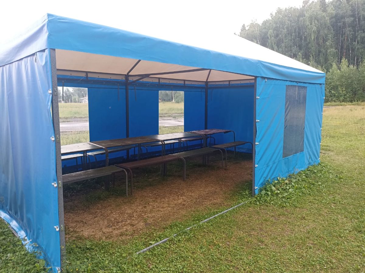 На фотографии изображён шатёр, предназначенный для использования на стадионе. Этот просторный и функциональный тент имеет размеры 3500х6000х3200 мм, что позволяет с комфортом разместить большое количество людей или оборудования. Конструкция шатра выполнена таким образом, чтобы обеспечить максимальное удобство и защиту от внешних факторов. Стены шатра изготовлены из высококачественного синего материала, который хорошо смотрится на фоне зелёной травы стадиона. Прозрачные окна, расположенные по бокам, пропускают достаточно света внутрь, создавая приятную атмосферу внутри помещения. Тент легко устанавливается благодаря своей модульной конструкции, что делает его идеальным выбором для проведения различных мероприятий на открытом воздухе. Он также удобен в транспортировке и хранении, что важно при организации временных мероприятий. Использование шатра на стадионе может быть разнообразным – от защиты зрителей от солнца или дождя до создания дополнительных зон для отдыха или торговли. Это универсальное решение для улучшения условий проведения спортивных событий и других активностей на свежем воздухе. Внутри шатра можно разместить мебель, например, скамейки или столы, что сделает его ещё более функциональным пространством. Возможность регулирования вентиляции и освещения добавляет комфорта при использовании шатра как в дневное, так и в вечернее время. Такой шатёр станет отличным дополнением к инфраструктуре любого стадиона, предоставляя дополнительные возможности для организации мероприятий различного масштаба. Его прочная конструкция и современный дизайн делают его привлекательным выбором для тех, кто ценит качество и надёжность.